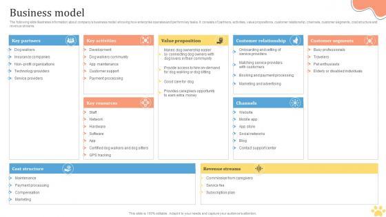 The following slide illustrates information about company business model showing how enterprise operates and perform key tasks. It consists of partners, activities, value propositions, customer relationship, channels, customer segments, cost structure and revenue streams. Boost your pitch with our creative Business Model Pet Care Solution Provider Investor Funding Elevator Pitch Deck. Deliver an awe-inspiring pitch that will mesmerize everyone. Using these presentation templates you will surely catch everyones attention. You can browse the ppts collection on our website. We have researchers who are experts at creating the right content for the templates. So you do not have to invest time in any additional work. Just grab the template now and use them. The following slide illustrates information about company business model showing how enterprise operates and perform key tasks. It consists of partners, activities, value propositions, customer relationship, channels, customer segments, cost structure and revenue streams.