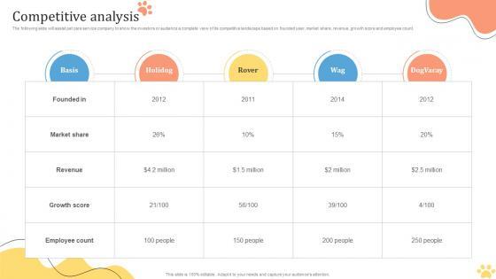 The following slide will assist pet care service company to show the investors or audience a complete view of its competitive landscape based on founded year, market share, revenue, growth score and employee count. Want to ace your presentation in front of a live audience Our Competitive Analysis Pet Care Solution Provider Investor Funding Elevator Pitch Deck can help you do that by engaging all the users towards you. Slidegeeks experts have put their efforts and expertise into creating these impeccable powerpoint presentations so that you can communicate your ideas clearly. Moreover, all the templates are customizable, and easy-to-edit and downloadable. Use these for both personal and commercial use. The following slide will assist pet care service company to show the investors or audience a complete view of its competitive landscape based on founded year, market share, revenue, growth score and employee count.