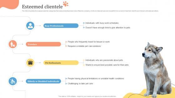 The following slide showcases customer categories that uses products and services offered by company which provides pet care service platform to owners to help them identify and interact with ideal pet sitters. Get a simple yet stunning designed Esteemed Clientele Pet Care Solution Provider Investor Funding Elevator Pitch Deck. It is the best one to establish the tone in your meetings. It is an excellent way to make your presentations highly effective. So, download this PPT today from Slidegeeks and see the positive impacts. Our easy-to-edit Esteemed Clientele Pet Care Solution Provider Investor Funding Elevator Pitch Deck can be your go-to option for all upcoming conferences and meetings. So, what are you waiting for Grab this template today. The following slide showcases customer categories that uses products and services offered by company which provides pet care service platform to owners to help them identify and interact with ideal pet sitters.