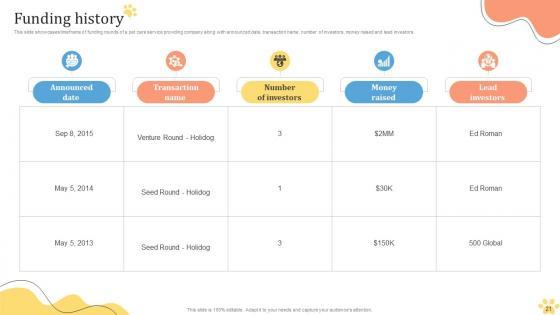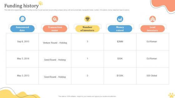 This slide showcases timeframe of funding rounds of a pet care service providing company along with announced date, transaction name, number of investors, money raised and lead investors. Do you have an important presentation coming up Are you looking for something that will make your presentation stand out from the rest Look no further than Funding History Pet Care Solution Provider Investor Funding Elevator Pitch Deck. With our professional designs, you can trust that your presentation will pop and make delivering it a smooth process. And with Slidegeeks, you can trust that your presentation will be unique and memorable. So why wait Grab Funding History Pet Care Solution Provider Investor Funding Elevator Pitch Deck today and make your presentation stand out from the rest This slide showcases timeframe of funding rounds of a pet care service providing company along with announced date, transaction name, number of investors, money raised and lead investors.