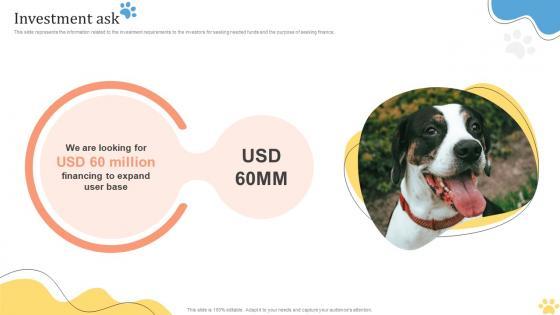 This slide represents the information related to the investment requirements to the investors for seeking needed funds and the purpose of seeking finance. Find highly impressive Investment Ask Pet Care Solution Provider Investor Funding Elevator Pitch Deck on Slidegeeks to deliver a meaningful presentation. You can save an ample amount of time using these presentation templates. No need to worry to prepare everything from scratch because Slidegeeks experts have already done a huge research and work for you. You need to download Investment Ask Pet Care Solution Provider Investor Funding Elevator Pitch Deck for your upcoming presentation. All the presentation templates are 100 percent editable and you can change the color and personalize the content accordingly. Download now This slide represents the information related to the investment requirements to the investors for seeking needed funds and the purpose of seeking finance.