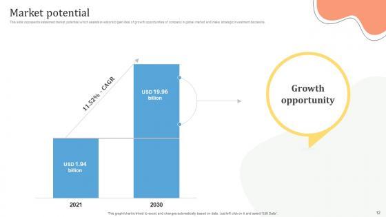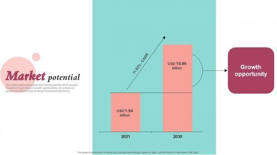 This slide represents esteemed market potential which assists investors to gain idea of growth opportunities of company in global market and make strategic investment decisions. Are you in need of a template that can accommodate all of your creative concepts This one is crafted professionally and can be altered to fit any style. Use it with Google Slides or PowerPoint. Include striking photographs, symbols, depictions, and other visuals. Fill, move around, or remove text boxes as desired. Test out color palettes and font mixtures. Edit and save your work, or work with colleagues. Download Market Potential Pet Care Solution Provider Investor Funding Elevator Pitch Deck and observe how to make your presentation outstanding. Give an impeccable presentation to your group and make your presentation unforgettable. This slide represents esteemed market potential which assists investors to gain idea of growth opportunities of company in global market and make strategic investment decisions.