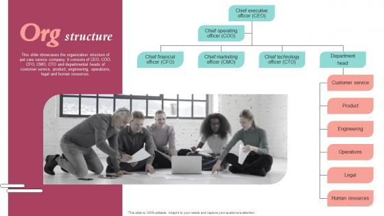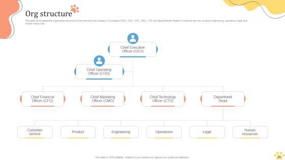 This slide showcases the organization structure of pet care service company. It consists of CEO, COO, CFO, CMO, CTO and departmental heads of customer service, product, engineering, operations, legal and human resources. Crafting an eye-catching presentation has never been more straightforward. Let your presentation shine with this tasteful yet straightforward Org Structure Pet Care Solution Provider Investor Funding Elevator Pitch Deck template. It offers a minimalistic and classy look that is great for making a statement. The colors have been employed intelligently to add a bit of playfulness while still remaining professional. Construct the ideal Org Structure Pet Care Solution Provider Investor Funding Elevator Pitch Deck that effortlessly grabs the attention of your audience Begin now and be certain to wow your customers This slide showcases the organization structure of pet care service company. It consists of CEO, COO, CFO, CMO, CTO and departmental heads of customer service, product, engineering, operations, legal and human resources.