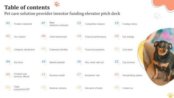 Welcome to our selection of the Table Of Contents Pet Care Solution Provider Investor Funding Elevator Pitch Deck. These are designed to help you showcase your creativity and bring your sphere to life. Planning and Innovation are essential for any business that is just starting out. This collection contains the designs that you need for your everyday presentations. All of our PowerPoints are 100Percent editable, so you can customize them to suit your needs. This multi-purpose template can be used in various situations. Grab these presentation templates today. Our Table Of Contents Pet Care Solution Provider Investor Funding Elevator Pitch Deck are topically designed to provide an attractive backdrop to any subject. Use them to look like a presentation pro.