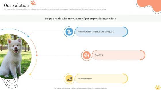 The following slide showcases solution offered by company which offers pet care services to the people owning pets to help them identify and interact with ideal pet sitters. If your project calls for a presentation, then Slidegeeks is your go to partner because we have professionally designed, easy to edit templates that are perfect for any presentation. After downloading, you can easily edit Our Solution Pet Care Company Investor Funding Elevator Pitch Deck Slides Pdf and make the changes accordingly. You can rearrange slides or fill them with different images. Check out all the handy templates The following slide showcases solution offered by company which offers pet care services to the people owning pets to help them identify and interact with ideal pet sitters.
