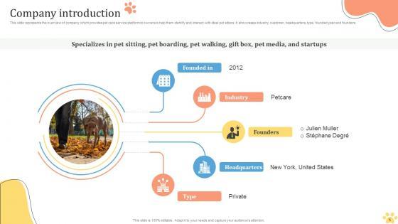This slide represents the overview of company which provides pet care service platform to owners to help them identify and interact with ideal pet sitters. It showcases industry, customer, headquarters, type, founded year and founders. Slidegeeks is one of the best resources for PowerPoint templates. You can download easily and regulate Company Introduction Pet Care Solution Provider Investor Funding Elevator Pitch Deck for your personal presentations from our wonderful collection. A few clicks is all it takes to discover and get the most relevant and appropriate templates. Use our Templates to add a unique zing and appeal to your presentation and meetings. All the slides are easy to edit and you can use them even for advertisement purposes. This slide represents the overview of company which provides pet care service platform to owners to help them identify and interact with ideal pet sitters. It showcases industry, customer, headquarters, type, founded year and founders.