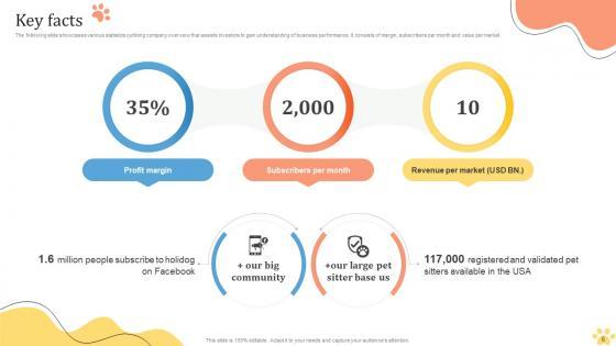 The following slide showcases various statistics outlining company overview that assists investors to gain understanding of business performance. It consists of margin, subscribers per month and value per market. If your project calls for a presentation, then Slidegeeks is your go-to partner because we have professionally designed, easy-to-edit templates that are perfect for any presentation. After downloading, you can easily edit Key Facts Pet Care Solution Provider Investor Funding Elevator Pitch Deck and make the changes accordingly. You can rearrange slides or fill them with different images. Check out all the handy templates The following slide showcases various statistics outlining company overview that assists investors to gain understanding of business performance. It consists of margin, subscribers per month and value per market.