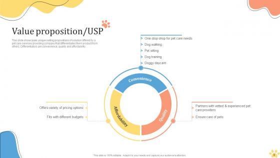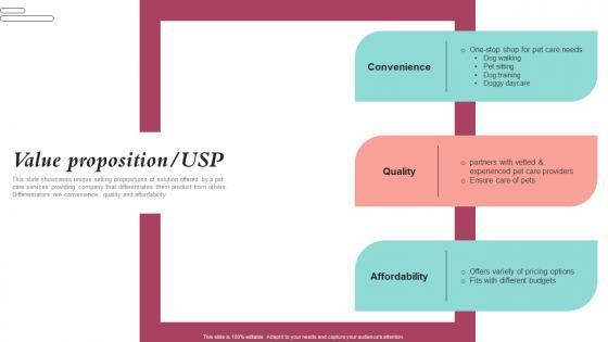 This slide showcases unique selling propositions of solution offered by a pet care services providing company that differentiates them product from others. Differentiators are convenience, quality and affordability. Coming up with a presentation necessitates that the majority of the effort goes into the content and the message you intend to convey. The visuals of a PowerPoint presentation can only be effective if it supplements and supports the story that is being told. Keeping this in mind our experts created Value Proposition USP Pet Care Company Investor Funding Elevator Pitch Deck Slides Pdf to reduce the time that goes into designing the presentation. This way, you can concentrate on the message while our designers take care of providing you with the right template for the situation. This slide showcases unique selling propositions of solution offered by a pet care services providing company that differentiates them product from others. Differentiators are convenience, quality and affordability.
