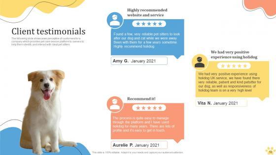 The following slide showcases perceptive of customers for a company which provides pet care service platform to owners to help them identify and interact with ideal pet sitters. Create an editable Client Testimonials Pet Care Solution Provider Investor Funding Elevator Pitch Deck that communicates your idea and engages your audience. Whether you are presenting a business or an educational presentation, pre-designed presentation templates help save time. Client Testimonials Pet Care Solution Provider Investor Funding Elevator Pitch Deck is highly customizable and very easy to edit, covering many different styles from creative to business presentations. Slidegeeks has creative team members who have crafted amazing templates. So, go and get them without any delay. The following slide showcases perceptive of customers for a company which provides pet care service platform to owners to help them identify and interact with ideal pet sitters.