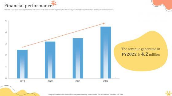 This slide showcases financial performance of business which assist investors to gain insights of business growth and development to make strategic investment decisions. Present like a pro with Financial Performance Pet Care Solution Provider Investor Funding Elevator Pitch Deck. Create beautiful presentations together with your team, using our easy-to-use presentation slides. Share your ideas in real-time and make changes on the fly by downloading our templates. So whether you are in the office, on the go, or in a remote location, you can stay in sync with your team and present your ideas with confidence. With Slidegeeks presentation got a whole lot easier. Grab these presentations today. This slide showcases financial performance of business which assist investors to gain insights of business growth and development to make strategic investment decisions.