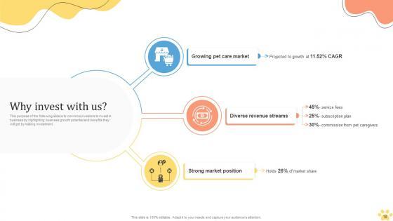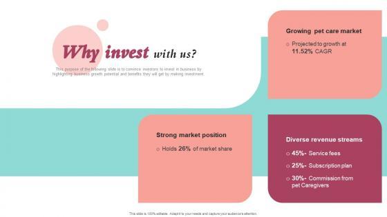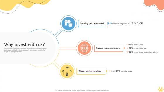 This purpose of the following slide is to convince investors to invest in business by highlighting business growth potential and benefits they will get by making investment. The best PPT templates are a great way to save time, energy, and resources. Slidegeeks have 100 percent editable powerpoint slides making them incredibly versatile. With these quality presentation templates, you can create a captivating and memorable presentation by combining visually appealing slides and effectively communicating your message. Download Why Invest With Us Pet Care Solution Provider Investor Funding Elevator Pitch Deck from Slidegeeks and deliver a wonderful presentation. This purpose of the following slide is to convince investors to invest in business by highlighting business growth potential and benefits they will get by making investment.