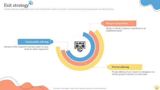 The slide provides most profitable or feasible ways for investors to exit from their investment in the company. It includes initial public offering, merger and acquisition and initial public offering. From laying roadmaps to briefing everything in detail, our templates are perfect for you. You can set the stage with your presentation slides. All you have to do is download these easy-to-edit and customizable templates. Exit Strategy Pet Care Solution Provider Investor Funding Elevator Pitch Deck will help you deliver an outstanding performance that everyone would remember and praise you for. Do download this presentation today. The slide provides most profitable or feasible ways for investors to exit from their investment in the company. It includes initial public offering, merger and acquisition and initial public offering.