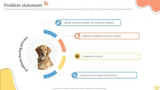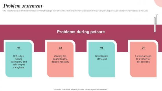This slide showcases identified problems that are commonly faced by pet owners for owning pets. It consist of challenges related to finding pet caregivers, dog walking, pet socialization and limited access of services. If you are looking for a format to display your unique thoughts, then the professionally designed Problem Statement Pet Care Company Investor Funding Elevator Pitch Deck Sample Pdf is the one for you. You can use it as a Google Slides template or a PowerPoint template. Incorporate impressive visuals, symbols, images, and other charts. Modify or reorganize the text boxes as you desire. Experiment with shade schemes and font pairings. Alter, share or cooperate with other people on your work. Download Problem Statement Pet Care Company Investor Funding Elevator Pitch Deck Sample Pdf and find out how to give a successful presentation. Present a perfect display to your team and make your presentation unforgettable. This slide showcases identified problems that are commonly faced by pet owners for owning pets. It consist of challenges related to finding pet caregivers, dog walking, pet socialization and limited access of services.