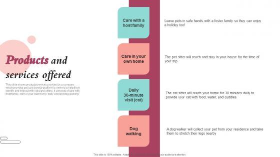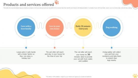 This slide shows products or services provided by a company which provides pet care service platform to owners to help them identify and interact with ideal pet sitters. It consists of care with host family, care in your own home, daily visit and dog walking. Coming up with a presentation necessitates that the majority of the effort goes into the content and the message you intend to convey. The visuals of a PowerPoint presentation can only be effective if it supplements and supports the story that is being told. Keeping this in mind our experts created Products And Services Offered Pet Care Solution Provider Investor Funding Elevator Pitch Deck to reduce the time that goes into designing the presentation. This way, you can concentrate on the message while our designers take care of providing you with the right template for the situation. This slide shows products or services provided by a company which provides pet care service platform to owners to help them identify and interact with ideal pet sitters. It consists of care with host family, care in your own home, daily visit and dog walking.