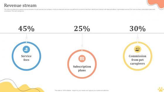 The following slide showcases revenue streams of a pet care service company which provides pet care service platform to owners to help them identify and interact with ideal pet sitters. It generates revenue from service fees, subscription plans and commission from pet caregivers. This modern and well-arranged Revenue Stream Pet Care Solution Provider Investor Funding Elevator Pitch Deck provides lots of creative possibilities. It is very simple to customize and edit with the Powerpoint Software. Just drag and drop your pictures into the shapes. All facets of this template can be edited with Powerpoint, no extra software is necessary. Add your own material, put your images in the places assigned for them, adjust the colors, and then you can show your slides to the world, with an animated slide included. The following slide showcases revenue streams of a pet care service company which provides pet care service platform to owners to help them identify and interact with ideal pet sitters. It generates revenue from service fees, subscription plans and commission from pet caregivers.