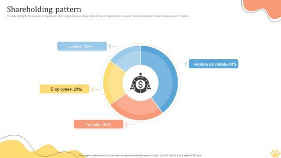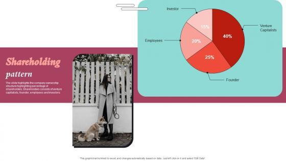 The slide highlights the company ownership structure highlighting percentage of shareholders. Shareholders consists of venture capitalists, founder, employees and investors. This Shareholding Pattern Pet Care Solution Provider Investor Funding Elevator Pitch Deck is perfect for any presentation, be it in front of clients or colleagues. It is a versatile and stylish solution for organizing your meetings. The Shareholding Pattern Pet Care Solution Provider Investor Funding Elevator Pitch Deck features a modern design for your presentation meetings. The adjustable and customizable slides provide unlimited possibilities for acing up your presentation. Slidegeeks has done all the homework before launching the product for you. So, do not wait, grab the presentation templates today The slide highlights the company ownership structure highlighting percentage of shareholders. Shareholders consists of venture capitalists, founder, employees and investors.