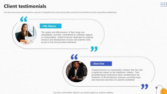 This slide covers various testimonials from customers. It highlights the top-notch service quality, products and brand reliability and helps in generating qualified leads. Create an editable Client Testimonials Pharmaceutical R And D Company Pitch Deck that communicates your idea and engages your audience. Whether you are presenting a business or an educational presentation, pre-designed presentation templates help save time. Client Testimonials Pharmaceutical R And D Company Pitch Deck is highly customizable and very easy to edit, covering many different styles from creative to business presentations. Slidegeeks has creative team members who have crafted amazing templates. So, go and get them without any delay. This slide covers various testimonials from customers. It highlights the top-notch service quality, products and brand reliability and helps in generating qualified leads.