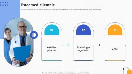 This slide emphasizes the successful partnerships and trusted relationships that the company has established with notable clients and customers. Get a simple yet stunning designed Esteemed Clientele Pharmaceutical R And D Company Pitch Deck. It is the best one to establish the tone in your meetings. It is an excellent way to make your presentations highly effective. So, download this PPT today from Slidegeeks and see the positive impacts. Our easy-to-edit Esteemed Clientele Pharmaceutical R And D Company Pitch Deck can be your go-to option for all upcoming conferences and meetings. So, what are you waiting for Grab this template today. This slide emphasizes the successful partnerships and trusted relationships that the company has established with notable clients and customers.