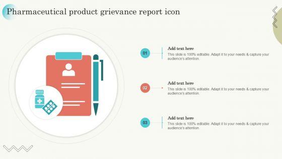 Presenting Pharmaceutical Product Grievance Report Icon Ideas PDF to dispense important information. This template comprises three stages. It also presents valuable insights into the topics including Pharmaceutical, Product, Grievance. This is a completely customizable PowerPoint theme that can be put to use immediately. So, download it and address the topic impactfully.