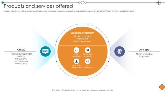 This slide highlights key products and services offered by digital pharmacies. It includes services such as care operations, supply chain operations, third-party integration, and data infrastructure. Slidegeeks has constructed Products And Services Offered Digital Pharmacy Company Investor Funding Ppt Slide after conducting extensive research and examination. These presentation templates are constantly being generated and modified based on user preferences and critiques from editors. Here, you will find the most attractive templates for a range of purposes while taking into account ratings and remarks from users regarding the content. This is an excellent jumping-off point to explore our content and will give new users an insight into our top-notch PowerPoint Templates. This slide highlights key products and services offered by digital pharmacies. It includes services such as care operations, supply chain operations, third-party integration, and data infrastructure.