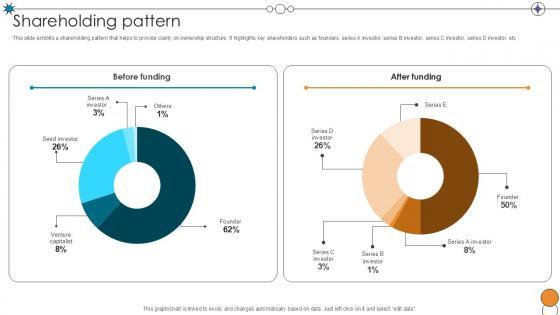 This slide exhibits a shareholding pattern that helps to provide clarity on ownership structure. It highlights key shareholders such as founders, series A investor, series B investor, series C investor, series D investor, etc. Here you can discover an assortment of the finest PowerPoint and Google Slides templates. With these templates, you can create presentations for a variety of purposes while simultaneously providing your audience with an eye-catching visual experience. Download Shareholding Pattern Digital Pharmacy Company Investor Funding Ppt Powerpoint to deliver an impeccable presentation. These templates will make your job of preparing presentations much quicker, yet still, maintain a high level of quality. Slidegeeks has experienced researchers who prepare these templates and write high-quality content for you. Later on, you can personalize the content by editing the Shareholding Pattern Digital Pharmacy Company Investor Funding Ppt Powerpoint. This slide exhibits a shareholding pattern that helps to provide clarity on ownership structure. It highlights key shareholders such as founders, series A investor, series B investor, series C investor, series D investor, etc
