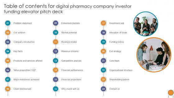 This Table Of Contents For Digital Pharmacy Company Investor Funding Ppt Sample from Slidegeeks makes it easy to present information on your topic with precision. It provides customization options, so you can make changes to the colors, design, graphics, or any other component to create a unique layout. It is also available for immediate download, so you can begin using it right away. Slidegeeks has done good research to ensure that you have everything you need to make your presentation stand out. Make a name out there for a brilliant performance. Our Table Of Contents For Digital Pharmacy Company Investor Funding Ppt Sample are topically designed to provide an attractive backdrop to any subject. Use them to look like a presentation pro.