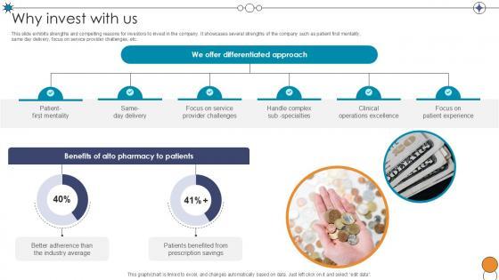 This slide exhibits strengths and compelling reasons for investors to invest in the company. It showcases several strengths of the company such as patient first mentality, same day delivery, focus on service provider challenges, etc. Do you know about Slidesgeeks Why Invest With Us Digital Pharmacy Company Investor Funding Ppt Slide These are perfect for delivering any kind od presentation. Using it, create PowerPoint presentations that communicate your ideas and engage audiences. Save time and effort by using our pre-designed presentation templates that are perfect for a wide range of topic. Our vast selection of designs covers a range of styles, from creative to business, and are all highly customizable and easy to edit. Download as a PowerPoint template or use them as Google Slides themes. This slide exhibits strengths and compelling reasons for investors to invest in the company. It showcases several strengths of the company such as patient first mentality, same day delivery, focus on service provider challenges, etc.