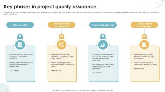 This slide shows major phases in project quality assurance that are required to meet the pre determined quality standards by the project team. It include phases such as process audits, training and skill development and defining quality metrics , etc. Retrieve professionally designed Key Phases In Project Quality Assurance Executing Quality Ppt Presentation PM SS V to effectively convey your message and captivate your listeners. Save time by selecting pre-made slideshows that are appropriate for various topics, from business to educational purposes. These themes come in many different styles, from creative to corporate, and all of them are easily adjustable and can be edited quickly. Access them as PowerPoint templates or as Google Slides themes. You do not have to go on a hunt for the perfect presentation because Slidegeeks got you covered from everywhere. This slide shows major phases in project quality assurance that are required to meet the pre determined quality standards by the project team. It include phases such as process audits, training and skill development and defining quality metrics , etc.