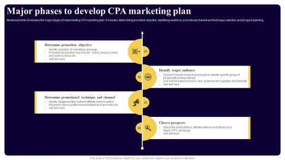 Mentioned slide showcases the major stages of implementing CPA marketing plan. It includes determining promotion objective, identifying audience, promotional channel and technique selection and prospect planning. This modern and well-arranged Major Phases To Develop CPA Marketing Plan Executing Cost Per Action Marketing Introduction Pdf provides lots of creative possibilities. It is very simple to customize and edit with the Powerpoint Software. Just drag and drop your pictures into the shapes. All facets of this template can be edited with Powerpoint no extra software is necessary. Add your own material, put your images in the places assigned for them, adjust the colors, and then you can show your slides to the world, with an animated slide included. Mentioned slide showcases the major stages of implementing CPA marketing plan. It includes determining promotion objective, identifying audience, promotional channel and technique selection and prospect planning.