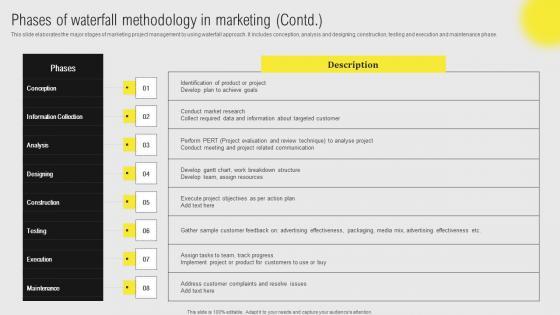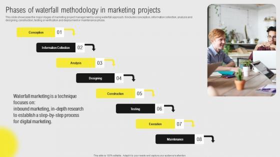 This slide showcases the major stages of marketing project management by using waterfall approach. It includes conception, information collection, analysis and designing, construction, testing or verification and deployment or maintenance phase. Whether you have daily or monthly meetings, a brilliant presentation is necessary. IT Projects Administration Through Waterfall Phases Of Waterfall Methodology Brochure Pdf can be your best option for delivering a presentation. Represent everything in detail using IT Projects Administration Through Waterfall Phases Of Waterfall Methodology Brochure Pdf and make yourself stand out in meetings. The template is versatile and follows a structure that will cater to your requirements. All the templates prepared by Slidegeeks are easy to download and edit. Our research experts have taken care of the corporate themes as well. So, give it a try and see the results. This slide showcases the major stages of marketing project management by using waterfall approach. It includes conception, information collection, analysis and designing, construction, testing or verification and deployment or maintenance phase.