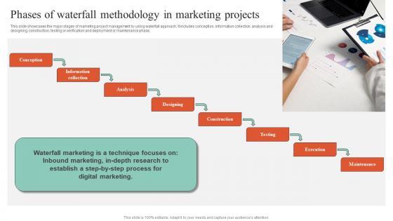 This slide showcases the major stages of marketing project management by using waterfall approach. It includes conception, information collection, analysis and designing, construction, testing or verification and deployment or maintenance phase. Do you have an important presentation coming up Are you looking for something that will make your presentation stand out from the rest Look no further than Phases Of Waterfall Methodology In Marketing Projects Ideas PDF. With our professional designs, you can trust that your presentation will pop and make delivering it a smooth process. And with Slidegeeks, you can trust that your presentation will be unique and memorable. So why wait Grab Phases Of Waterfall Methodology In Marketing Projects Ideas PDF today and make your presentation stand out from the rest