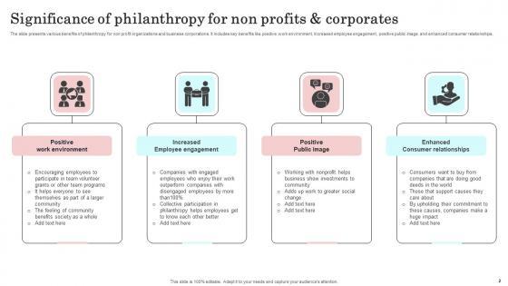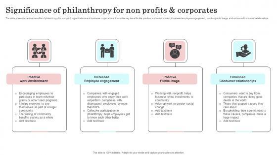 The slide presents various benefits of philanthropy for non profit organizations and business corporations. It includes key benefits like positive work environment, increased employee engagement, positive public image and enhanced consumer relationships. Showcasing this set of slides titled Significance Of Philanthropy For Non Profits And Corporates Portrait Pdf. The topics addressed in these templates are Positive Work Environment, Increased Employee Engagement, Positive Public Image. All the content presented in this PPT design is completely editable. Download it and make adjustments in color, background, font etc. as per your unique business setting. The slide presents various benefits of philanthropy for non profit organizations and business corporations. It includes key benefits like positive work environment, increased employee engagement, positive public image and enhanced consumer relationships.