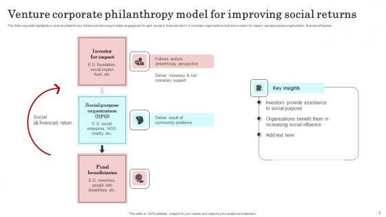 The following slide highlights a venture philanthropy framework showing investor engagement to gain social and financial return. It includes organizations that are investor for impact, social purpose organization, final beneficiaries. Pitch your topic with ease and precision using this Venture Corporate Philanthropy Model For Improving Social Returns Ideas Pdf. This layout presents information on Investor Impact, Social Purpose Organization, Final Beneficiaries. It is also available for immediate download and adjustment. So, changes can be made in the color, design, graphics or any other component to create a unique layout. The following slide highlights a venture philanthropy framework showing investor engagement to gain social and financial return. It includes organizations that are investor for impact, social purpose organization, final beneficiaries.