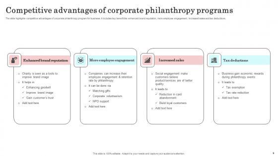 The slide highlights competitive advantages of corporate philanthropy program for business. It includes key benefit like enhanced brand reputation, more employee engagement, increased sales and tax deductions. Pitch your topic with ease and precision using this Competitive Advantages Of Corporate Philanthropy Programs Diagrams Pdf. This layout presents information on Enhanced Brand Reputation, More Employee Engagement, Increased Sales. It is also available for immediate download and adjustment. So, changes can be made in the color, design, graphics or any other component to create a unique layout. The slide highlights competitive advantages of corporate philanthropy program for business. It includes key benefit like enhanced brand reputation, more employee engagement, increased sales and tax deductions.