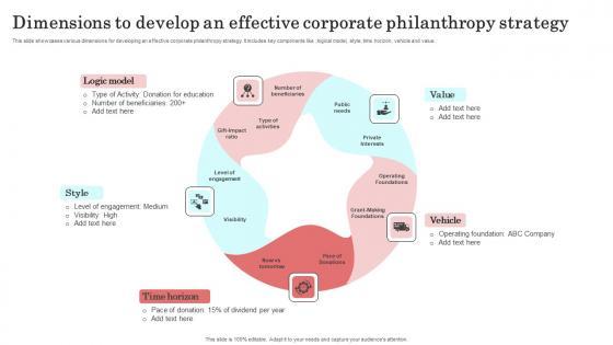 This slide showcases various dimensions for developing an effective corporate philanthropy strategy. It includes key components like logical model, style, time horizon, vehicle and value. Showcasing this set of slides titled Dimensions To Develop An Effective Corporate Philanthropy Strategy Demonstration Pdf. The topics addressed in these templates are Logic Model, Value, Vehicle. All the content presented in this PPT design is completely editable. Download it and make adjustments in color, background, font etc. as per your unique business setting. This slide showcases various dimensions for developing an effective corporate philanthropy strategy. It includes key components like logical model, style, time horizon, vehicle and value.
