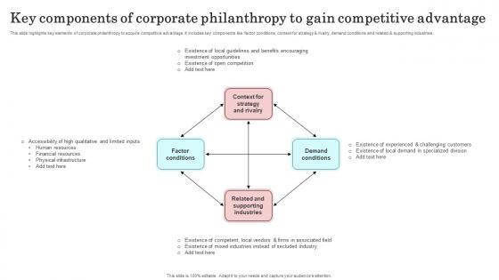 This slide highlights key elements of corporate philanthropy to acquire competitive advantage. It includes key components like factor conditions, context for strategy and rivalry, demand conditions and related and supporting industries. Showcasing this set of slides titled Key Components Of Corporate Philanthropy To Gain Competitive Advantage Information Pdf. The topics addressed in these templates are Demand Conditions, Factor Conditions, Related Supporting Industries. All the content presented in this PPT design is completely editable. Download it and make adjustments in color, background, font etc. as per your unique business setting. This slide highlights key elements of corporate philanthropy to acquire competitive advantage. It includes key components like factor conditions, context for strategy and rivalry, demand conditions and related and supporting industries.
