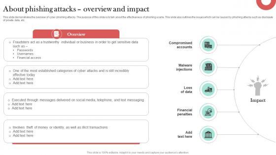 This slide demonstrates the overview of cyber phishing attacks. The purpose of this slide is to talk about the effectiveness of phishing scams. This slide also outlines the issues which can be caused by phishing attacks such as disclosure of private data, etc. Get a simple yet stunning designed About Phishing Attacks Overview And Impact Man In The Middle Phishing IT. It is the best one to establish the tone in your meetings. It is an excellent way to make your presentations highly effective. So, download this PPT today from Slidegeeks and see the positive impacts. Our easy-to-edit About Phishing Attacks Overview And Impact Man In The Middle Phishing IT can be your go-to option for all upcoming conferences and meetings. So, what are you waiting for Grab this template today. This slide demonstrates the overview of cyber phishing attacks. The purpose of this slide is to talk about the effectiveness of phishing scams. This slide also outlines the issues which can be caused by phishing attacks such as disclosure of private data, etc.