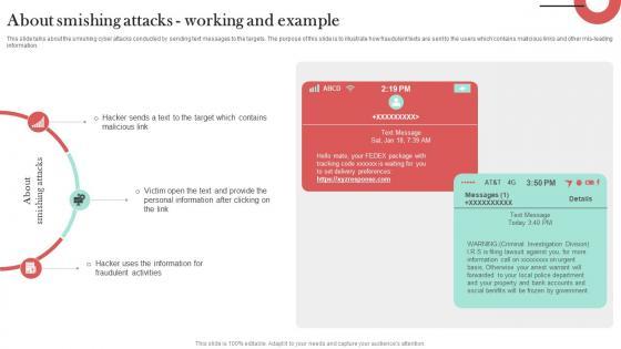 This slide talks about the smishing cyber attacks conducted by sending text messages to the targets. The purpose of this slide is to illustrate how fraudulent texts are sent to the users which contains malicious links and other mis-leading information. Slidegeeks is here to make your presentations a breeze with About Smishing Attacks Working And Example Man In The Middle Phishing IT With our easy-to-use and customizable templates, you can focus on delivering your ideas rather than worrying about formatting. With a variety of designs to choose from, you are sure to find one that suits your needs. And with animations and unique photos, illustrations, and fonts, you can make your presentation pop. So whether you are giving a sales pitch or presenting to the board, make sure to check out Slidegeeks first This slide talks about the smishing cyber attacks conducted by sending text messages to the targets. The purpose of this slide is to illustrate how fraudulent texts are sent to the users which contains malicious links and other mis-leading information.