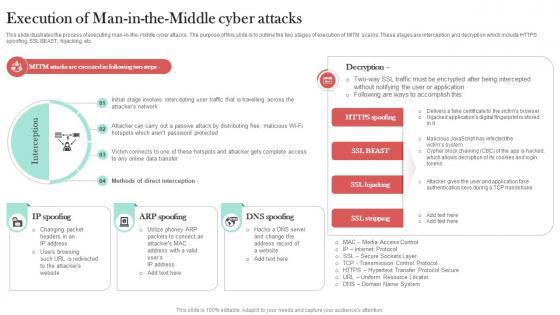 This slide illustrates the process of executing man-in-the-middle cyber attacks. The purpose of this slide is to outline the two stages of execution of MITM scams. These stages are interception and decryption which include HTTPS spoofing, SSL BEAST, hijacking, etc. Welcome to our selection of the Execution Of Man In The Middle Cyber Attacks Man In The Middle Phishing IT. These are designed to help you showcase your creativity and bring your sphere to life. Planning and Innovation are essential for any business that is just starting out. This collection contains the designs that you need for your everyday presentations. All of our PowerPoints are 100Percent editable, so you can customize them to suit your needs. This multi-purpose template can be used in various situations. Grab these presentation templates today. This slide illustrates the process of executing man-in-the-middle cyber attacks. The purpose of this slide is to outline the two stages of execution of MITM scams. These stages are interception and decryption which include HTTPS spoofing, SSL BEAST, hijacking, etc.
