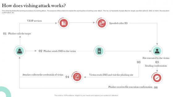 This slide illustrates the working procedure of a vishing attack. The purpose of this slide is to explain the working flow of vishing cyber attack. The key components include attacker, target, spoofed caller ID, SMS to victim, file execution confirmation, etc. The How Does Vishing Attack Works Man In The Middle Phishing IT is a compilation of the most recent design trends as a series of slides. It is suitable for any subject or industry presentation, containing attractive visuals and photo spots for businesses to clearly express their messages. This template contains a variety of slides for the user to input data, such as structures to contrast two elements, bullet points, and slides for written information. Slidegeeks is prepared to create an impression. This slide illustrates the working procedure of a vishing attack. The purpose of this slide is to explain the working flow of vishing cyber attack. The key components include attacker, target, spoofed caller ID, SMS to victim, file execution confirmation, etc.