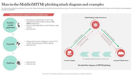 This slide demonstrates the working flow of man-in-the-middle phishing attacks using MITM phishing toolkit cloud server. This slide also elaborates the various real-world examples of MITM attacks such as Equifaxs mobile application, superfish and DigiNotar. Do you know about Slidesgeeks Man In The Middlemitm Phishing Attack Man In The Middle Phishing IT These are perfect for delivering any kind od presentation. Using it, create PowerPoint presentations that communicate your ideas and engage audiences. Save time and effort by using our pre-designed presentation templates that are perfect for a wide range of topic. Our vast selection of designs covers a range of styles, from creative to business, and are all highly customizable and easy to edit. Download as a PowerPoint template or use them as Google Slides themes. This slide demonstrates the working flow of man-in-the-middle phishing attacks using MITM phishing toolkit cloud server. This slide also elaborates the various real-world examples of MITM attacks such as Equifaxs mobile application, superfish and DigiNotar.