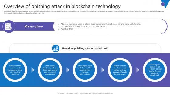 The following slide illustrates brief introduction of phishing attacks impacting blockchian to minimize theft of user data. It includes elements such as sharing personal information, sending fake links through emails, stealing private keys, gaining access to account details, data breach, etc. Presenting this PowerPoint presentation, titled Overview Of Phishing Attack Comprehensive Guide To Blockchain Digital Security Summary Pdf, with topics curated by our researchers after extensive research. This editable presentation is available for immediate download and provides attractive features when used. Download now and captivate your audience. Presenting this Overview Of Phishing Attack Comprehensive Guide To Blockchain Digital Security Summary Pdf. Our researchers have carefully researched and created these slides with all aspects taken into consideration. This is a completely customizable Overview Of Phishing Attack Comprehensive Guide To Blockchain Digital Security Summary Pdf that is available for immediate downloading. Download now and make an impact on your audience. Highlight the attractive features available with our PPTs. The following slide illustrates brief introduction of phishing attacks impacting blockchian to minimize theft of user data. It includes elements such as sharing personal information, sending fake links through emails, stealing private keys, gaining access to account details, data breach, etc.