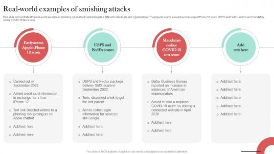 This slide demonstrates the real-world example of smishing cyber attacks which targeted different individuals and organizations. The popular scams are early access apple iPhone 12 scam, USPS and FedEx scams and mandatory online COVID-19 test scam. Do you have an important presentation coming up Are you looking for something that will make your presentation stand out from the rest Look no further than Real World Examples Of Smishing Attacks Man In The Middle Phishing IT. With our professional designs, you can trust that your presentation will pop and make delivering it a smooth process. And with Slidegeeks, you can trust that your presentation will be unique and memorable. So why wait Grab Real World Examples Of Smishing Attacks Man In The Middle Phishing IT today and make your presentation stand out from the rest This slide demonstrates the real-world example of smishing cyber attacks which targeted different individuals and organizations. The popular scams are early access apple iPhone 12 scam, USPS and FedEx scams and mandatory online COVID-19 test scam.