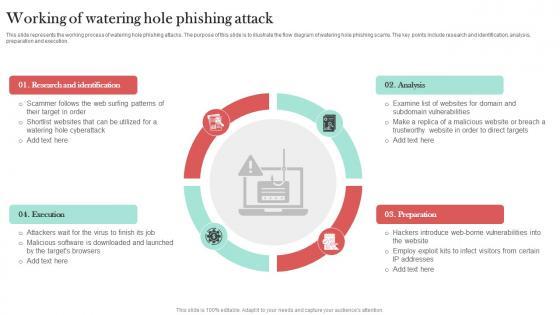 This slide represents the working process of watering hole phishing attacks. The purpose of this slide is to illustrate the flow diagram of watering hole phishing scams. The key points include research and identification, analysis, preparation and execution. This Working Of Watering Hole Phishing Attack Man In The Middle Phishing IT from Slidegeeks makes it easy to present information on your topic with precision. It provides customization options, so you can make changes to the colors, design, graphics, or any other component to create a unique layout. It is also available for immediate download, so you can begin using it right away. Slidegeeks has done good research to ensure that you have everything you need to make your presentation stand out. Make a name out there for a brilliant performance. This slide represents the working process of watering hole phishing attacks. The purpose of this slide is to illustrate the flow diagram of watering hole phishing scams. The key points include research and identification, analysis, preparation and execution.