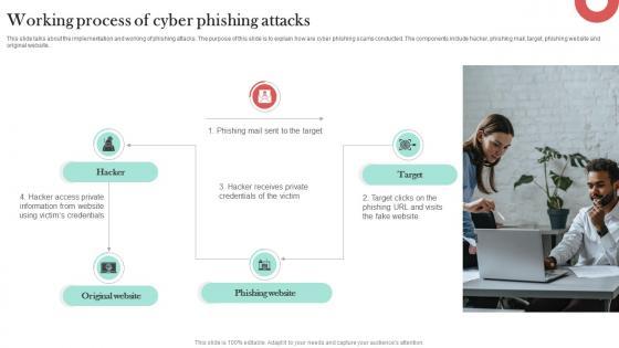 This slide talks about the implementation and working of phishing attacks. The purpose of this slide is to explain how are cyber phishing scams conducted. The components include hacker, phishing mail, target, phishing website and original website. Do you know about Slidesgeeks Working Process Of Cyber Phishing Attacks Man In The Middle Phishing IT These are perfect for delivering any kind od presentation. Using it, create PowerPoint presentations that communicate your ideas and engage audiences. Save time and effort by using our pre-designed presentation templates that are perfect for a wide range of topic. Our vast selection of designs covers a range of styles, from creative to business, and are all highly customizable and easy to edit. Download as a PowerPoint template or use them as Google Slides themes. This slide talks about the implementation and working of phishing attacks. The purpose of this slide is to explain how are cyber phishing scams conducted. The components include hacker, phishing mail, target, phishing website and original website.