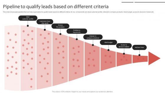 This slide showcases pipeline that can help organization to qualify leads based on different criteria. Its key components are ideal customer profile, interest in company products. Ideal budget, access to decision makers etc. Create an editable Phone Sales Strategy To Drive Pipeline To Qualify Leads Based On Different Strategy SS V that communicates your idea and engages your audience. Whether you are presenting a business or an educational presentation, pre-designed presentation templates help save time. Phone Sales Strategy To Drive Pipeline To Qualify Leads Based On Different Strategy SS V is highly customizable and very easy to edit, covering many different styles from creative to business presentations. Slidegeeks has creative team members who have crafted amazing templates. So, go and get them without any delay. This slide showcases pipeline that can help organization to qualify leads based on different criteria. Its key components are ideal customer profile, interest in company products. Ideal budget, access to decision makers etc.