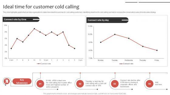 This slide highlights graphs that can help organization to determine ideal time and day for cold calling customers. Identifying ideal time for cold calling can help to increase the conversation sales of inside sales strategy. Formulating a presentation can take up a lot of effort and time, so the content and message should always be the primary focus. The visuals of the PowerPoint can enhance the presenters message, so our Phone Sales Strategy To Drive Ideal Time For Customer Cold Calling Strategy SS V was created to help save time. Instead of worrying about the design, the presenter can concentrate on the message while our designers work on creating the ideal templates for whatever situation is needed. Slidegeeks has experts for everything from amazing designs to valuable content, we have put everything into Phone Sales Strategy To Drive Ideal Time For Customer Cold Calling Strategy SS V. This slide highlights graphs that can help organization to determine ideal time and day for cold calling customers. Identifying ideal time for cold calling can help to increase the conversation sales of inside sales strategy.