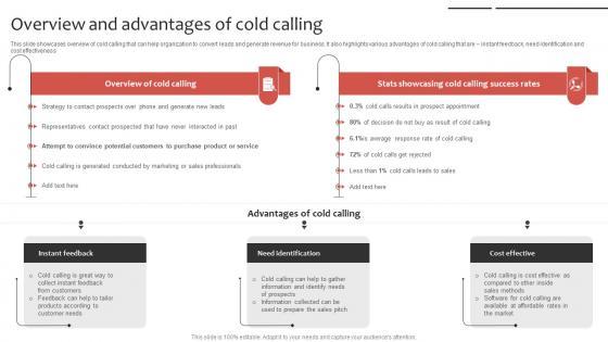 This slide showcases overview of cold calling that can help organization to convert leads and generate revenue for business. It also highlights various advantages of cold calling that are instant feedback, need identification and cost effectiveness. Take your projects to the next level with our ultimate collection of Phone Sales Strategy To Drive Overview And Advantages Of Cold Calling Strategy SS V. Slidegeeks has designed a range of layouts that are perfect for representing task or activity duration, keeping track of all your deadlines at a glance. Tailor these designs to your exact needs and give them a truly corporate look with your own brand colors they will make your projects stand out from the rest This slide showcases overview of cold calling that can help organization to convert leads and generate revenue for business. It also highlights various advantages of cold calling that are instant feedback, need identification and cost effectiveness.