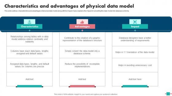 This slide outlines characteristics and advantages of physical data model along with its impact. It also explains the impact of converting the data model into database schema. There are so many reasons you need a Characteristics Advantages Physical Data Modeling Approaches For Modern Analytics Template Pdf. The first reason is you can not spend time making everything from scratch, Thus, Slidegeeks has made presentation templates for you too. You can easily download these templates from our website easily. This slide outlines characteristics and advantages of physical data model along with its impact. It also explains the impact of converting the data model into database schema.