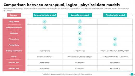 This slide represents the difference between main models of data modeling, such as conceptual, logical, and physical. The comparison is based on features covering entity names, relationships, attributes, primary and foreign keys, and so on. Make sure to capture your audiences attention in your business displays with our gratis customizable Database Modeling Structures Comparison Between Conceptual Logical Physical Data Models Introduction Pdf. These are great for business strategies, office conferences, capital raising or task suggestions. If you desire to acquire more customers for your tech business and ensure they stay satisfied, create your own sales presentation with these plain slides. This slide represents the difference between main models of data modeling, such as conceptual, logical, and physical. The comparison is based on features covering entity names, relationships, attributes, primary and foreign keys, and so on.